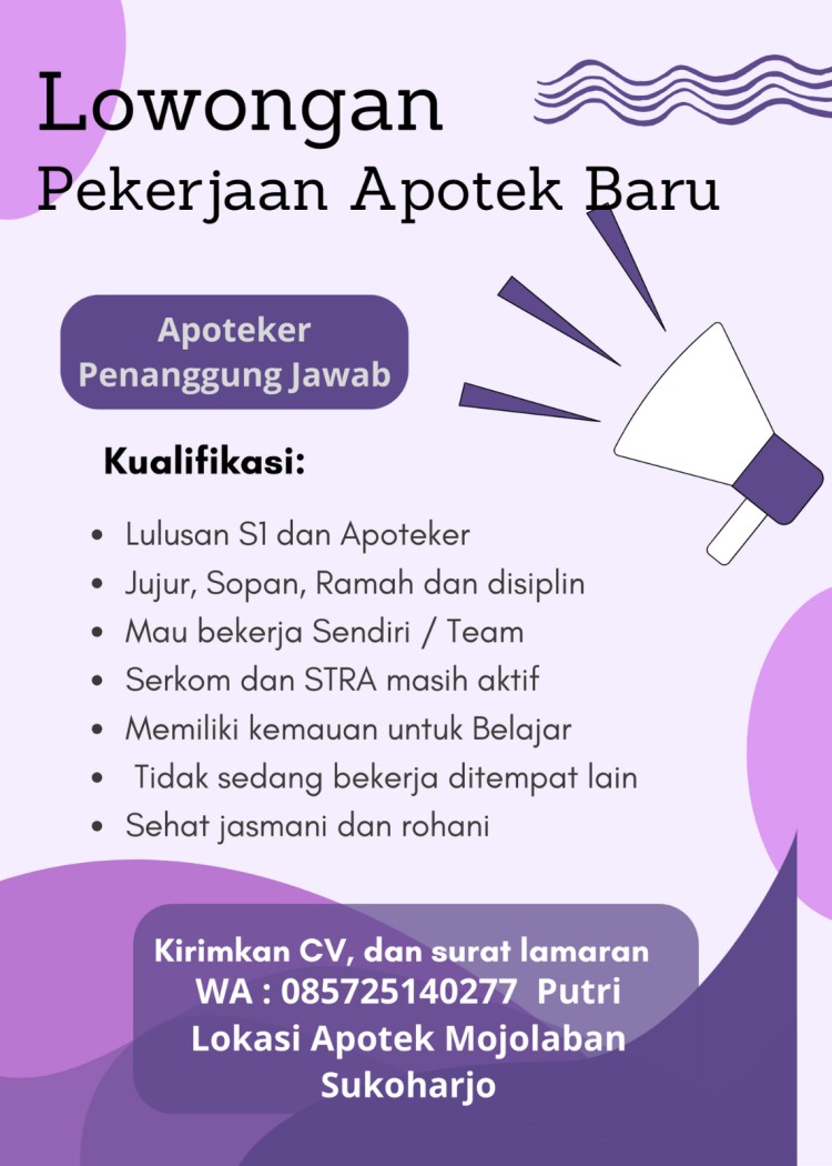 Lowongan Pekerjaan Apoteker untuk Apotek Baru di Mojolaban Sukoharjo